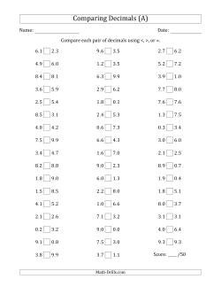 The comparing decimals worksheets have students compare pairs of numbers and the ordering decimals worksheets have students compare a list of numbers by sorting them.