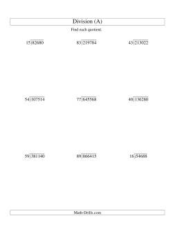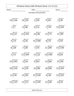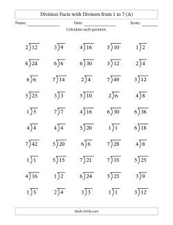 On this page you will find many Division Worksheets including division facts and long division with and without remainders. We start off with some division facts which are just the multiplication facts expressed in a different way. The main difference is that you can't divide by 0 and get a real number. If you really want your students to impress, say at their dinner table when their parents ask them what they learned today, you can teach them that division by zero is undefined.