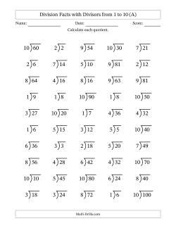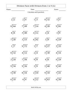Welcome to the division worksheets page at Math-Drills.com! Please give us your undivided attention while we introduce this page. Our worksheets for division help you to teach students the very important concept of division. If students have a good recall of multiplication facts, the division facts should be a breeze to teach. If you want your students to experience success in learning division, please make sure they know their multiplication facts to 81, how to multiply by 0 and how to multiply by 10. If they don't know these things, learning division will take a lot longer.
