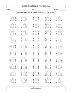 The worksheets in this section also include improper fractions. This might make the task of comparing even easier for some questions that involve both a proper and an improper fraction. If students recognize one fraction is greater than one and the other fraction is less than one, the greater fraction will be obvious.
