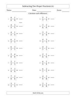 Subtracting Two Proper Fractions with Similar Denominators, Proper Fractions Results, and No Simplifying (Fillable, Savable, Printable) ✎ Subtracting Two Proper Fractions with Similar Denominators, Proper Fractions Results, and All Simplifying (Fillable, Savable, Printable) ✎ Subtracting Two Proper Fractions with Similar Denominators, Proper Fractions Results, and Some Simplifying (Fillable, Savable, Printable) ✎ Subtracting Two Proper Fractions with Similar Denominators, Proper Fractions Results, and No Simplifying (Printable Only) Subtracting Two Proper Fractions with Similar Denominators, Proper Fractions Results, and All Simplifying (Printable Only) Subtracting Two Proper Fractions with Similar Denominators, Proper Fractions Results, and Some Simplifying (Printable Only)