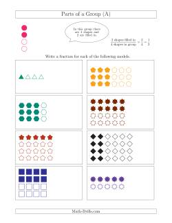 Coloring Groups of Shapes to Represent Fractions Identifying Fractions from Colored Groups of Shapes (Only Simplified Fractions up to Eighths) Identifying Fractions from Colored Groups of Shapes (Halves Only) Identifying Fractions from Colored Groups of Shapes (Halves and Thirds) Identifying Fractions from Colored Groups of Shapes (Halves, Thirds and Fourths) Identifying Fractions from Colored Groups of Shapes (Up to Fifths) Identifying Fractions from Colored Groups of Shapes (Up to Sixths) Identifying Fractions from Colored Groups of Shapes (Up to Eighths) Identifying Fractions from Colored Groups of Shapes (OLD Version; Print Too Light)